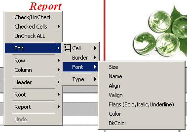 Edit/Font/BkColor - задание цвета фона ячейки (в идеологии Visual FoxPro, т.е. представьте, что в качестве цвета выступает результат функции RGB(Red,Green,Blue) ). В качестве выражения может выступать численное значение, выражение FoxPro или програмный код FoxPro