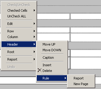 Header/Delete - удаление хедера вместе со всем содержимым. Нельзя полностью удалить хедер, если он единственный в репорте.