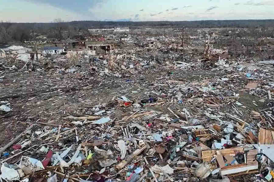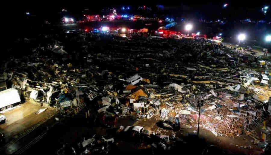 Торнадо со скоростью ветра 455 км/ч находился на земле в течение 90 минут. Губернатор штата объявил чрезвычайное положение и задействовал охрану и полицию штата. Такое большое количество жертв предполагается, так как торнадо разрушил завод в Мэйфилде, где в тот момент находилось около 110 человек.