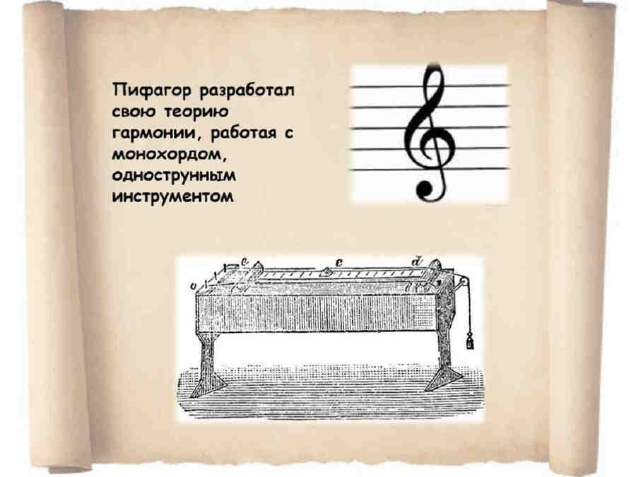 Пифагор заметил, что звуки, производимые разными музыкальными инструментами, имеют определенные математические соотношения. Он обнаружил, что отношения длин струн инструментов, когда они вибрируют, образуют простые числовые соотношения. Например, если одна струна имеет длину в два раза больше другой, они производят звуки, относящиеся к интервалу октавы.