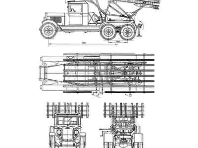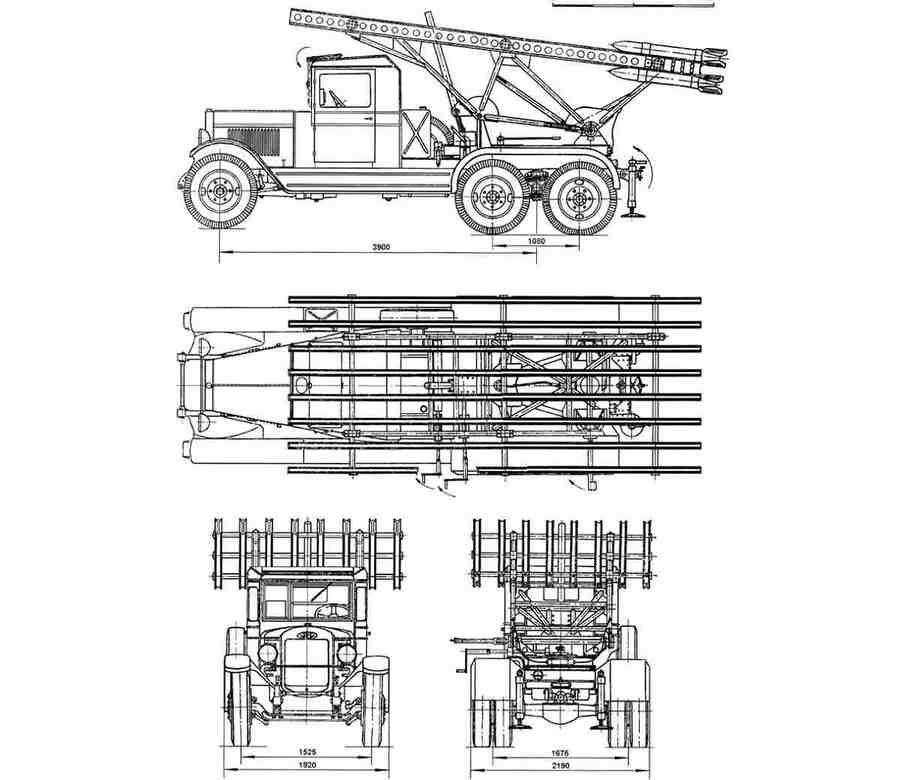 На направляющей попарно сверху и снизу крепилось шестнадцать реактивных снарядов М-13. Каждый снаряд состоял из реактивного порохового двигателя и головной части. Дополнительную устойчивость при выстреле передавали два домкрата, которые тоже могли находиться в задней части шасси. А стекла кабина накрывались откидными броневыми щитами для защиты.