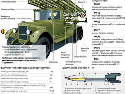 БМ-13 представляла собой пусковую установку, смонтированную на шасси грузовика. Основной элемент системы – направляющие рельсы, по которым запускались реактивные снаряды М-13.