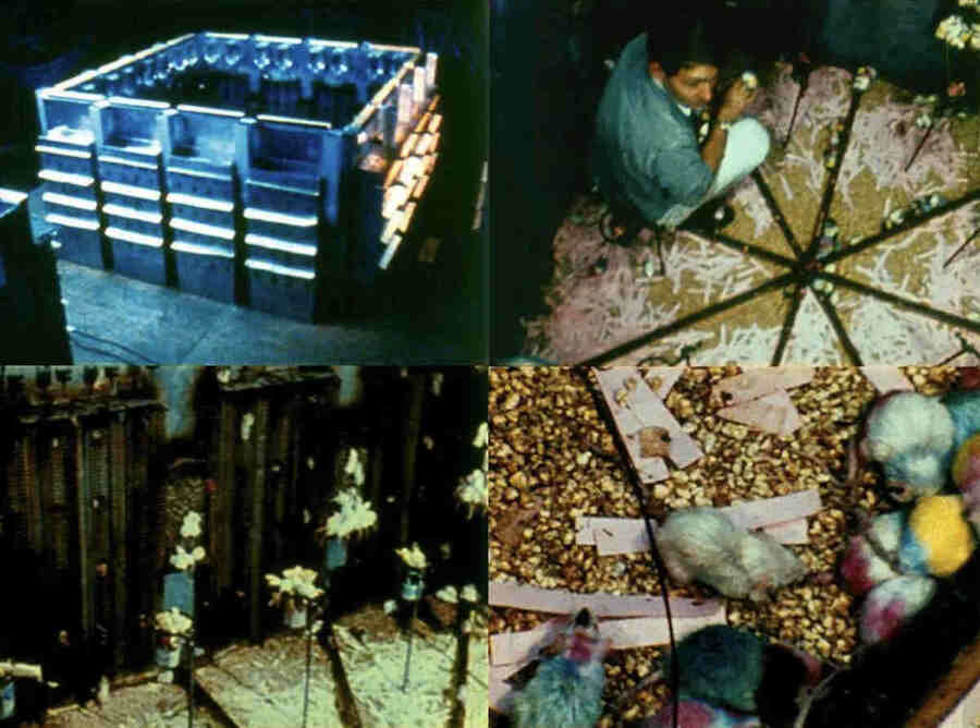 Создание среды: Кэлхун построил большой закрытый контейнер размером 2,7 на 2,7 метра и высотой полтора, который представлял собой сложное многоуровневое пространство, предоставляющее мышам комфортные условия для жизни.