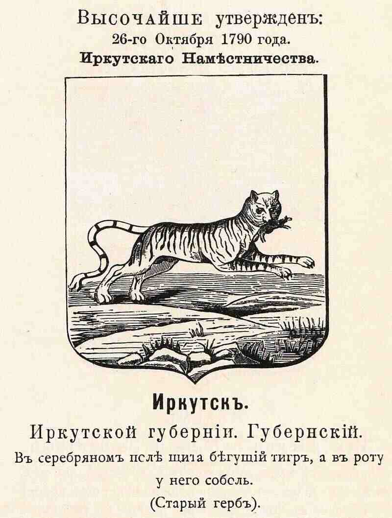 Бабр, то есть тигр, встречался иногда в Забайкалье, которое в XVIII веке входило в Иркутское наместничество, а иногда и западнее Байкала. Таким образом, в гербе Иркутска были изображены самый необычный зверь для европейской России и соболь, дававший самый ценный мех. Рисунок этот находится на городских печатях Иркутска 1711 и 1743 годов. Бабыр (тюрк.) — пантера, то есть чёрный барс. Возможно, именно поэтому позднее изображение бабра на гербе — чёрного цвета. (на фарси «babre» означает «тигр»)