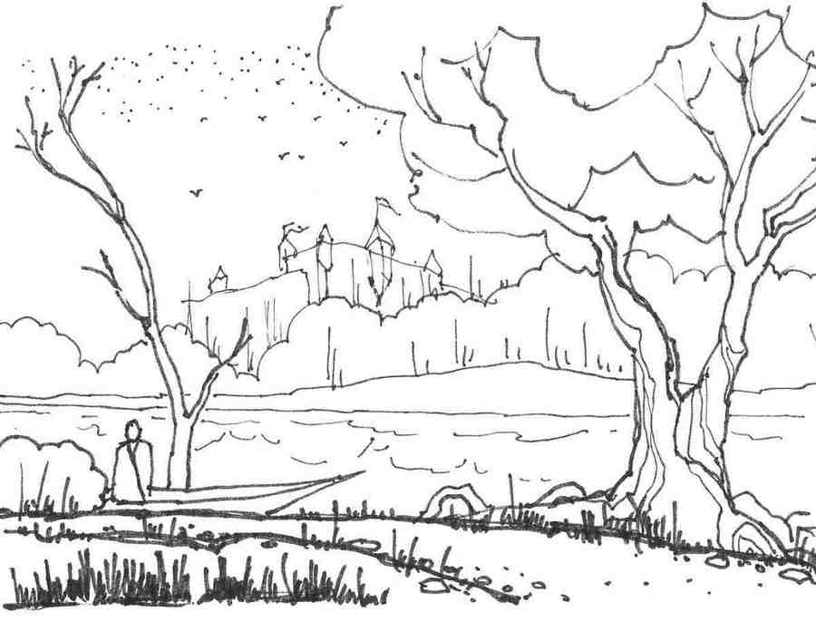 За широкой рекой, сквозь деревья проступают контуры замка – он-то Вам и нужен, но надо как-то перебираться через реку.